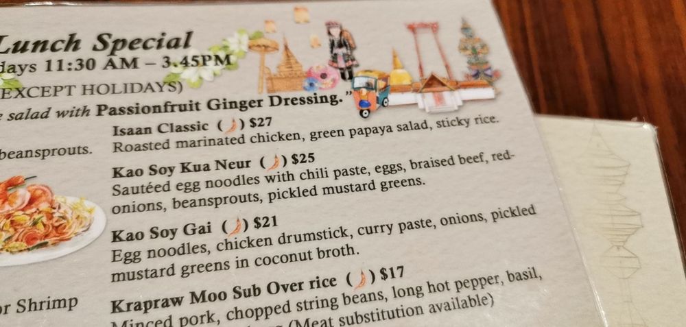 Roasted chicken, green papaya salad and sticky rice. Contains peanuts